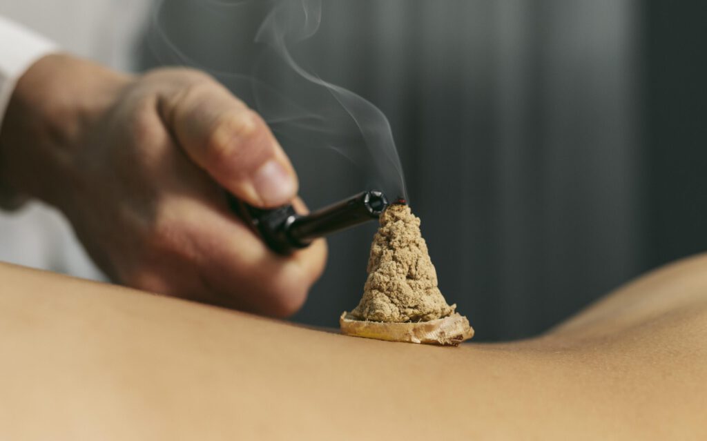 Bei der Moxibustion werden die Akupunkturpunkte durch brennendes Beifusskraut erwärmt und damit ähnlich wie in der Akupunktur der Energiefluss angeregt.